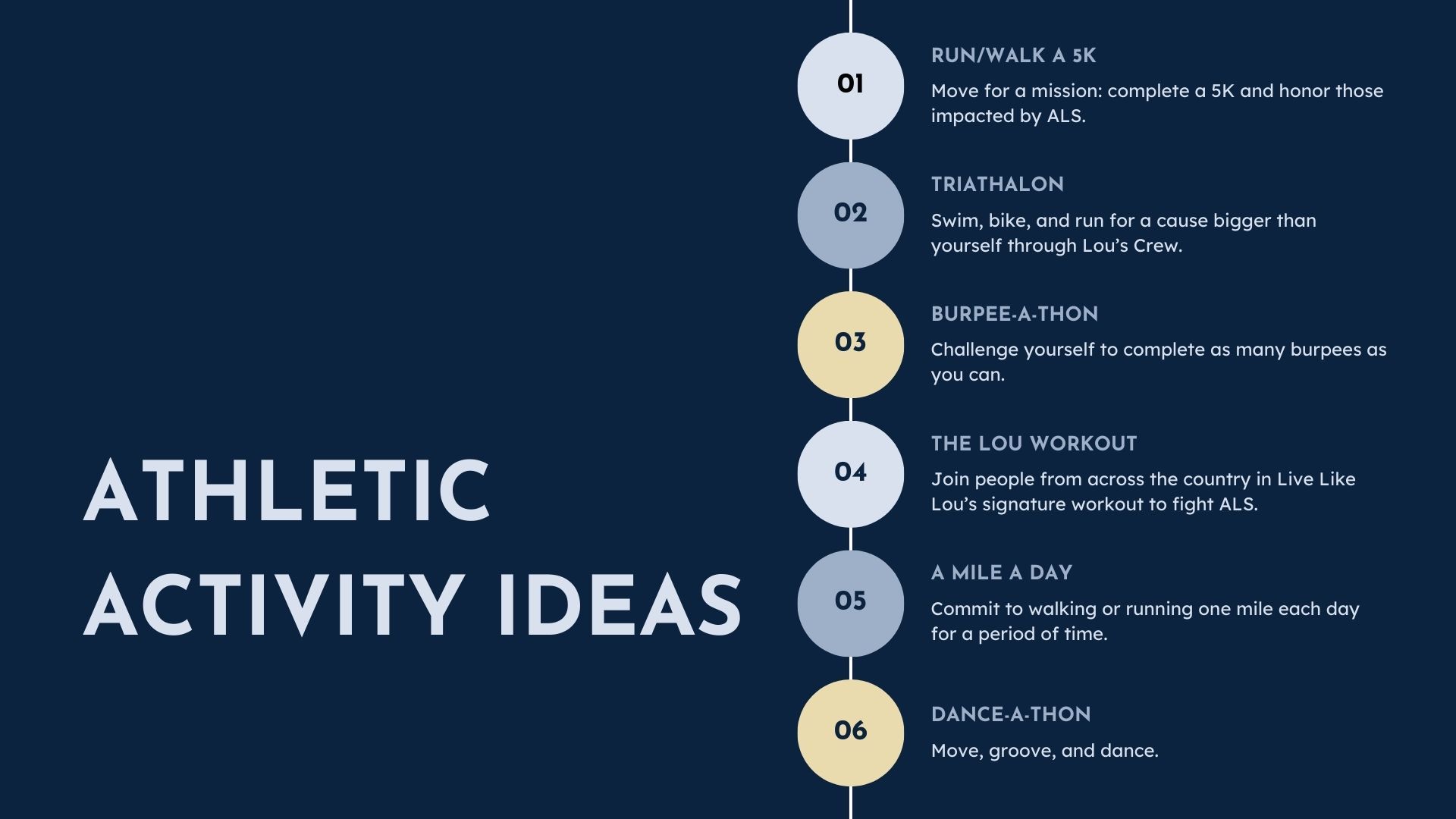 Lou’s Crew is designed for anyone who wants to take on an athletic activity and be part of something bigger than themselves. Whether celebrating a birthday, training for a 5k, committing to walk a mile a day, and more, you can make an impact. Lou's Crew gives you the tools and inspiration to turn what you love doing into meaningful,